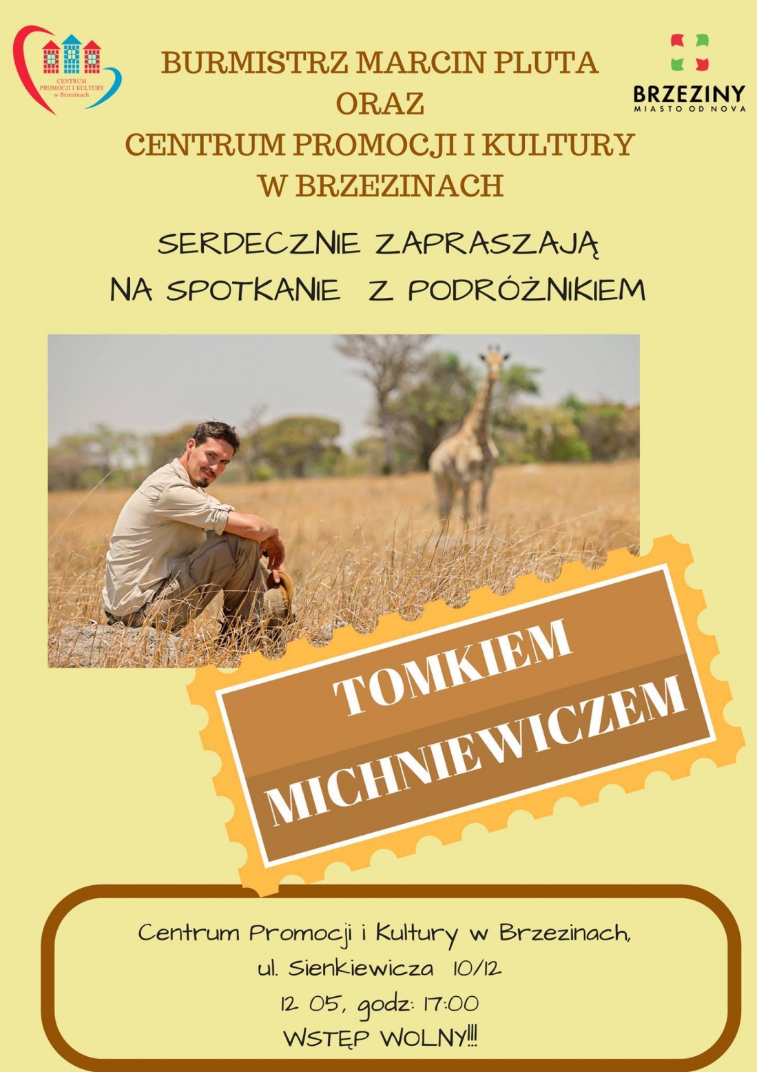 12 maja Brzeziny odwiedzi fantastyczny gość - podróżnik Tomek Michniewicz. Spotkanie z podróżnikiem odbędzie się w sali Centrum Promocji i Kultury w Brzezinach.