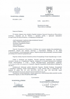 W imieniu Wojewody Łódzkiego oraz członków kapituły konkursu Nagroda Gospodarcza Województwa Łodzkiego, zwracamy się do Państwa z uprzejmą prośbą o zgłaszanie kandydatów do tegorocznej XII edycji Konkursu.