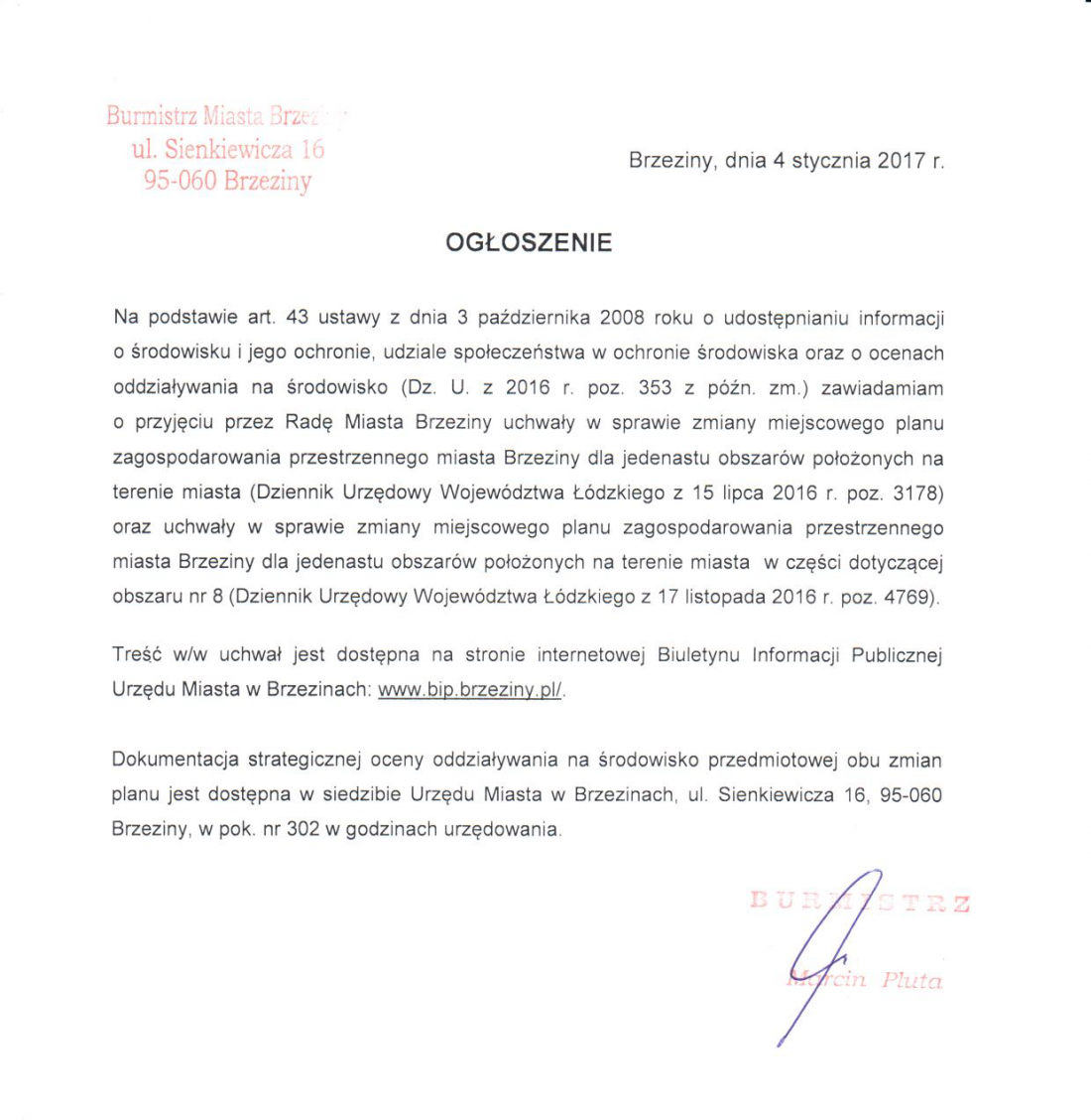 o przyjęciu przez Radę Miasta Brzeziny uchwały w sprawie zmiany miejscowego planu zagospodarowania przestrzennego miasta Brzeziny dla jedenastu obszarów położonych na terenie miasta (Dziennik Urzędowy Województwa Łódzkiego z 15 lipca 2016 r. poz. 3178) oraz uchwały w sprawie zmiany miejscowego planu zagospodarowania przestrzennego miasta Brzeziny dla jedenastu obszarów położonych na terenie miasta w części dotyczącej obszaru nr 8 (Dziennik Urzędowy Województwa Łódzkiego z 17 listopada 2016 r. poz. 4769).