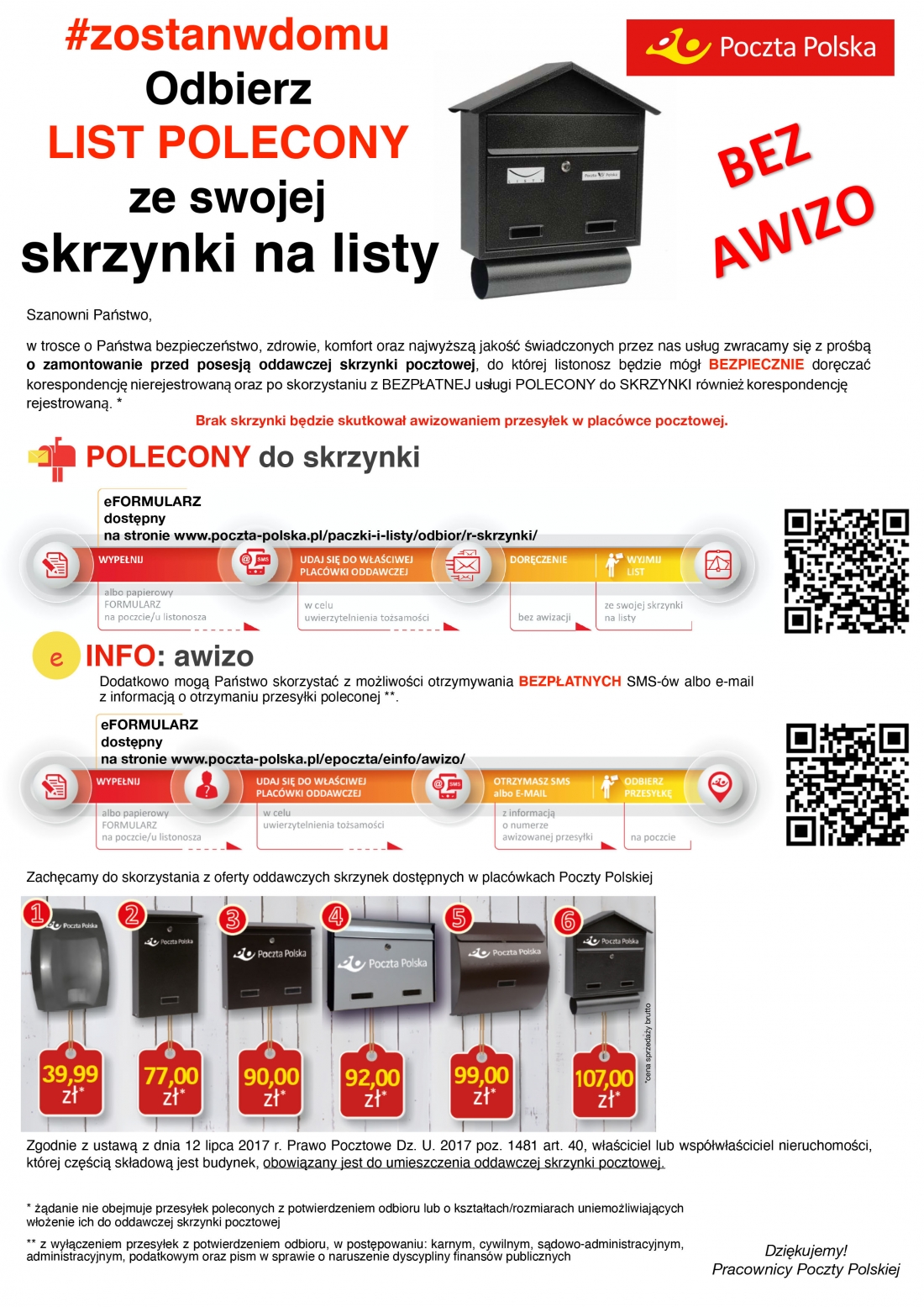 Szczególna sytuacja związana z epidemią, w praktyce utrudnia dziś wielu osobom nieposiadającym skrzynek, korzystanie z usług pocztowych. Odbiór korespondencji rejestrowanej wymaga bowiem wizyty w placówce pocztowej.