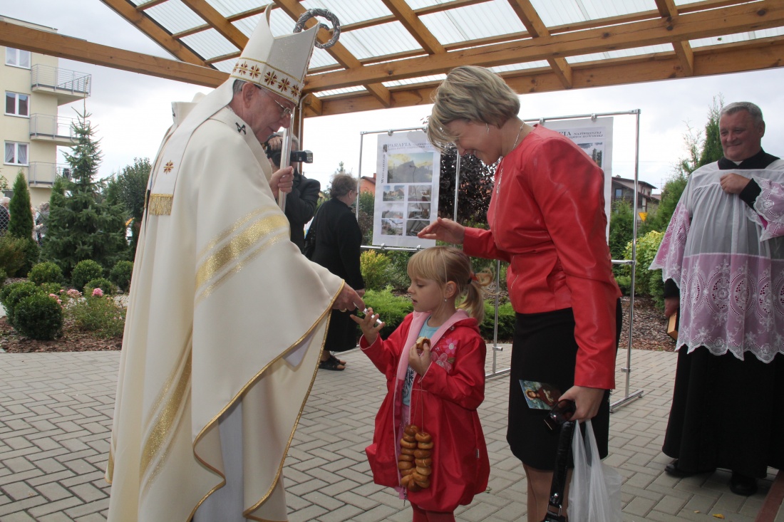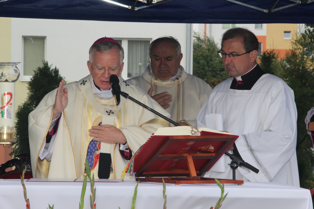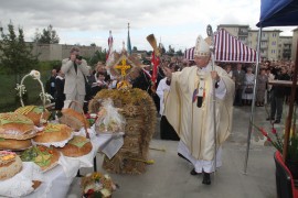 Msza święta rozpoczęła się od poświęcenia fundamentów budowanego kościoła przez abp. Marka Jędraszewskiego. Podczas dziękczynnej mszy rolnicy gminy Brzeziny w darze ołtarza złożyli plony swojej codziennej pracy - bochen chleba oraz dzban miodu. Uroczystej sumie oprawę muzyczną zapewniła orkiestra Ochotniczej Straży Pożarnej z Przecławia pod kierownictwem kapelmistrza Bogdana Ruszera.