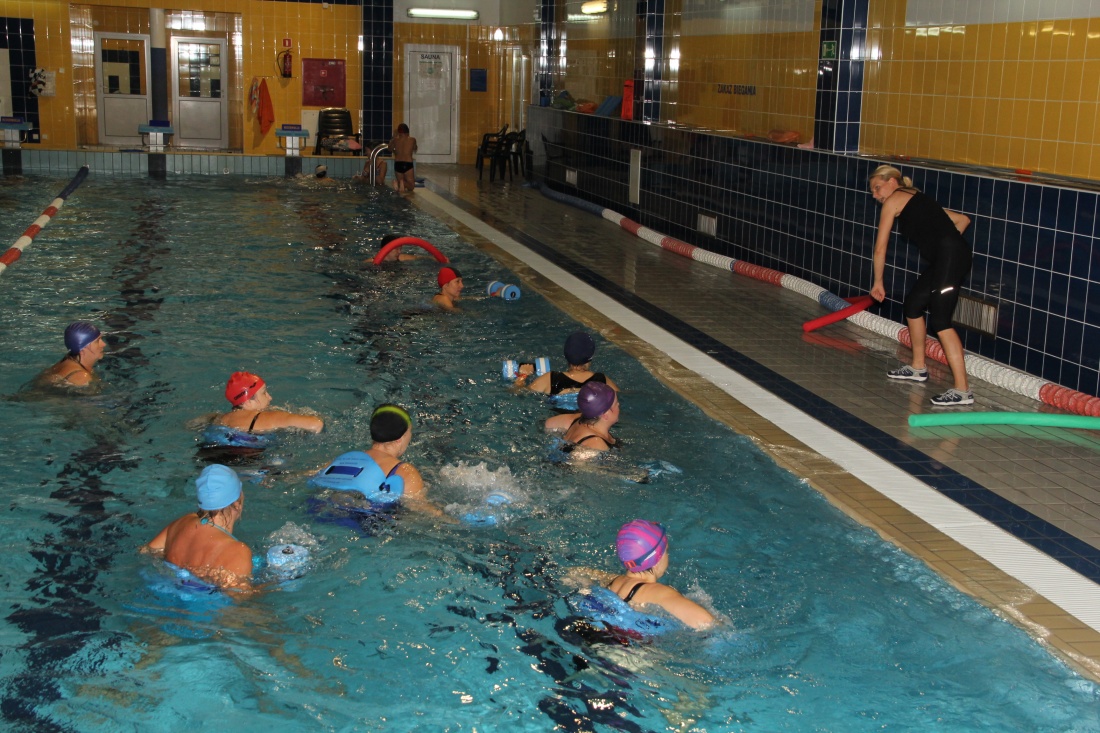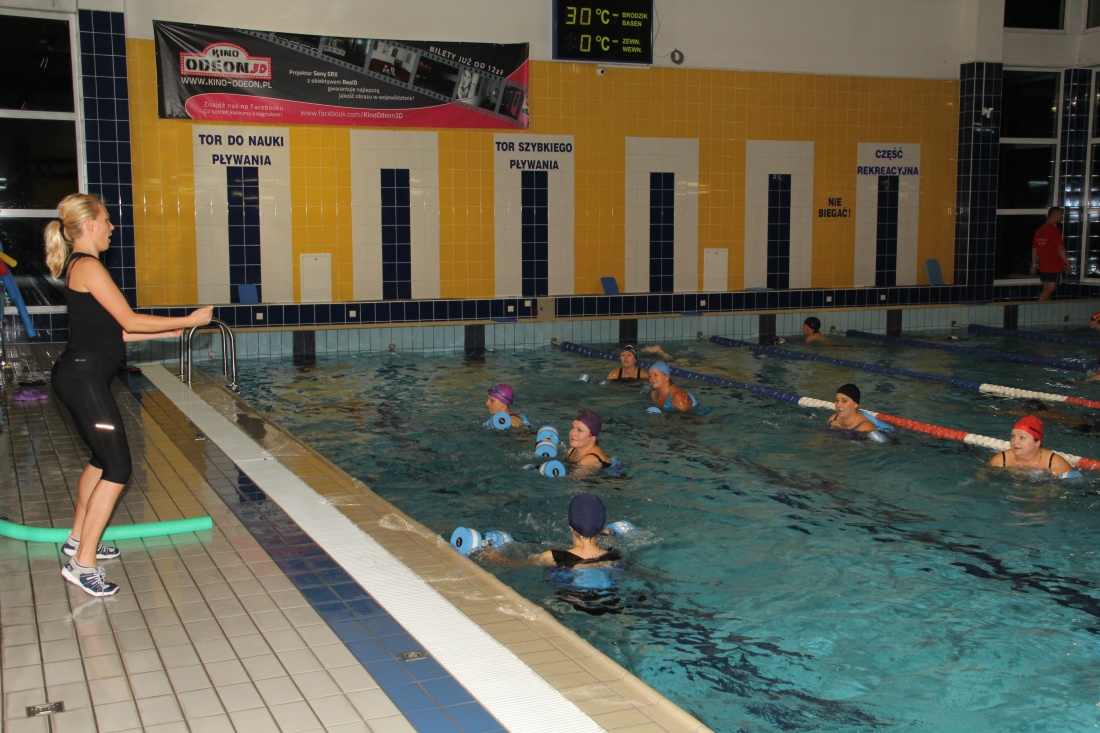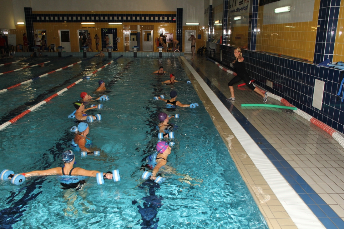 Aqua aerobik to ćwiczenia przeznaczone głównie dla kobiet, które wykonywane są w wodzie. 45 - minutowe zajęcie odbywają się dwa razy w tygodniu w poniedziałek i środę o godz. 19.00 i 19.45 w grupach liczących do 10 osób. Na krytej pływalni Centrum Kultury Fizycznej w Brzezinach aqua aerobik od ponad roku prowadzi Aneta Prusinowska.