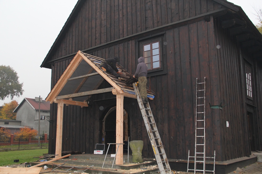 Prace polegające na odtworzeniu dawnego zadaszenia przy kościele św. Anny w Brzezinach prowadzą górale z Podsarnia k. Rabki. Na odtworzenie modrzewiowego zadaszenia zgodę wyraził Wojewódzki Konserwator Zabytków w Łodzi.