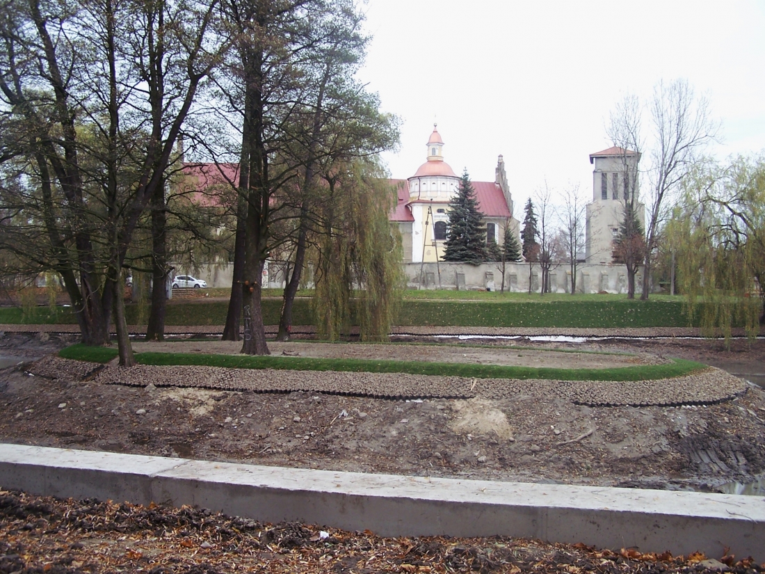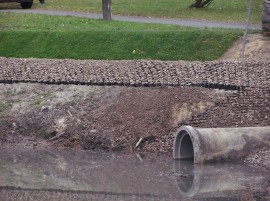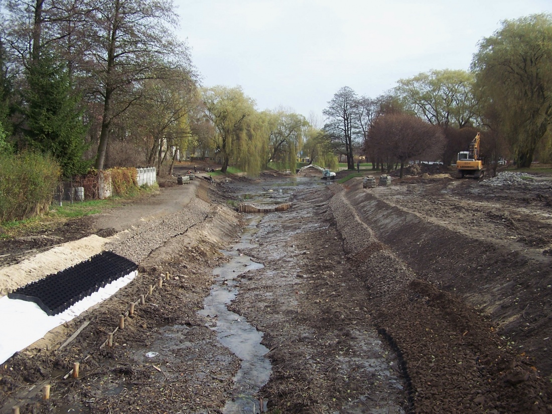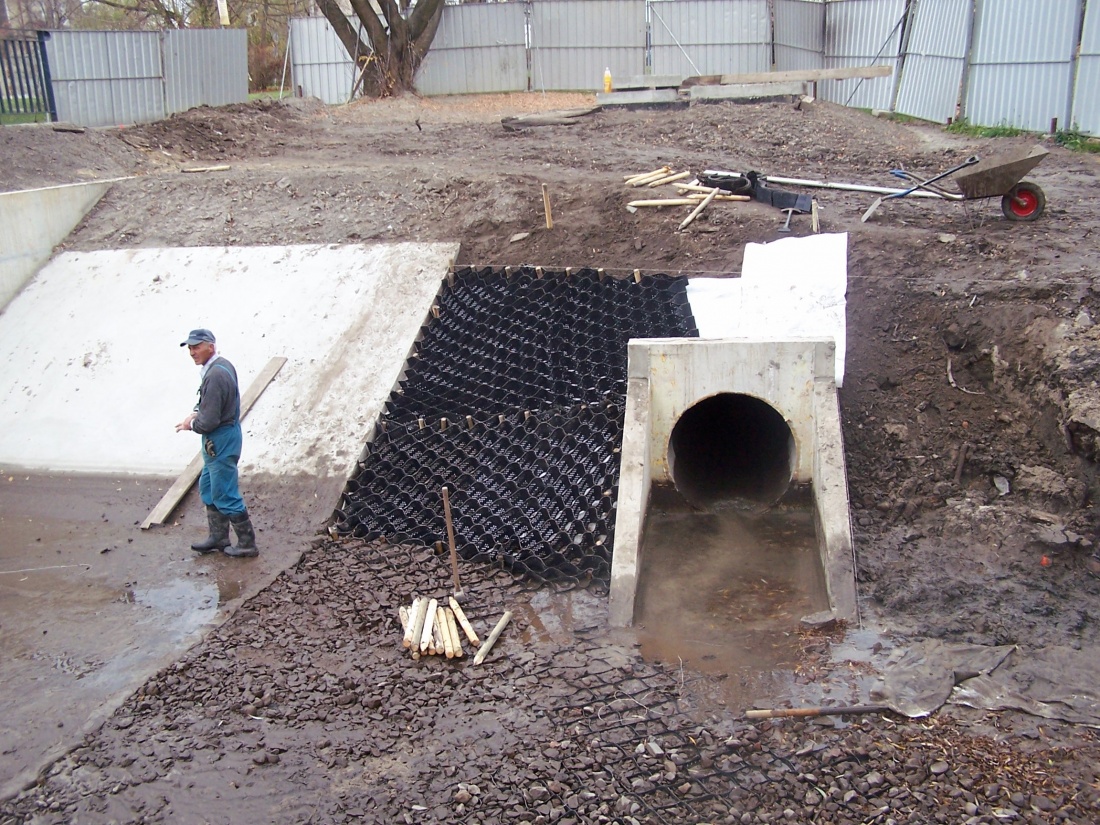 Obecnie brzeg stawu wykładany jest matą komórkową i kamieniami, zabezpieczanymi od spodu geowłókniną. Częśc brzegu pokryto już darniną w rolkach.