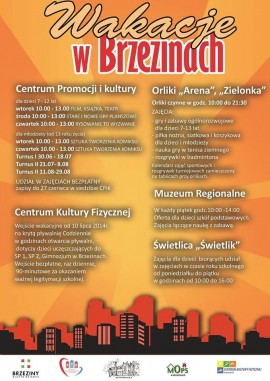 Wejście wakacyjne od 10 lipca 2014 r. na kryta pływalnie codziennie w godzinach otwarcia pływalni, dotyczy dzieci uczęszczających do SP 1, SP 2, Gimnazjum w Brzezinach.