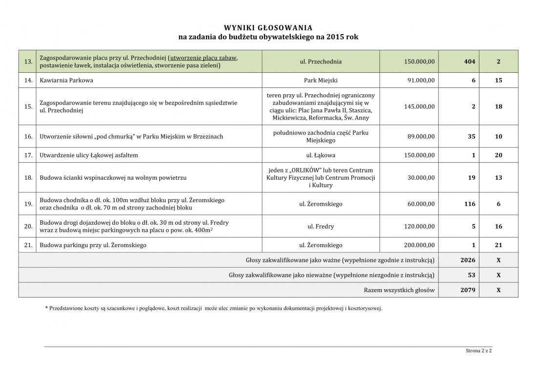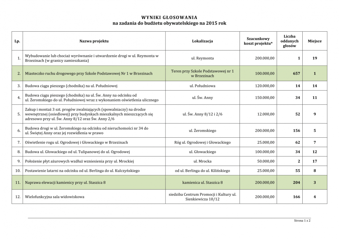 Prezentujemy wyniki Państwa głosowania na projekty inwestycyjne realizowane w ramach Budżetu Obywatelskiego na rok 2015 r.