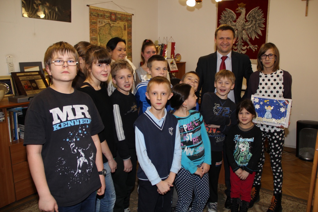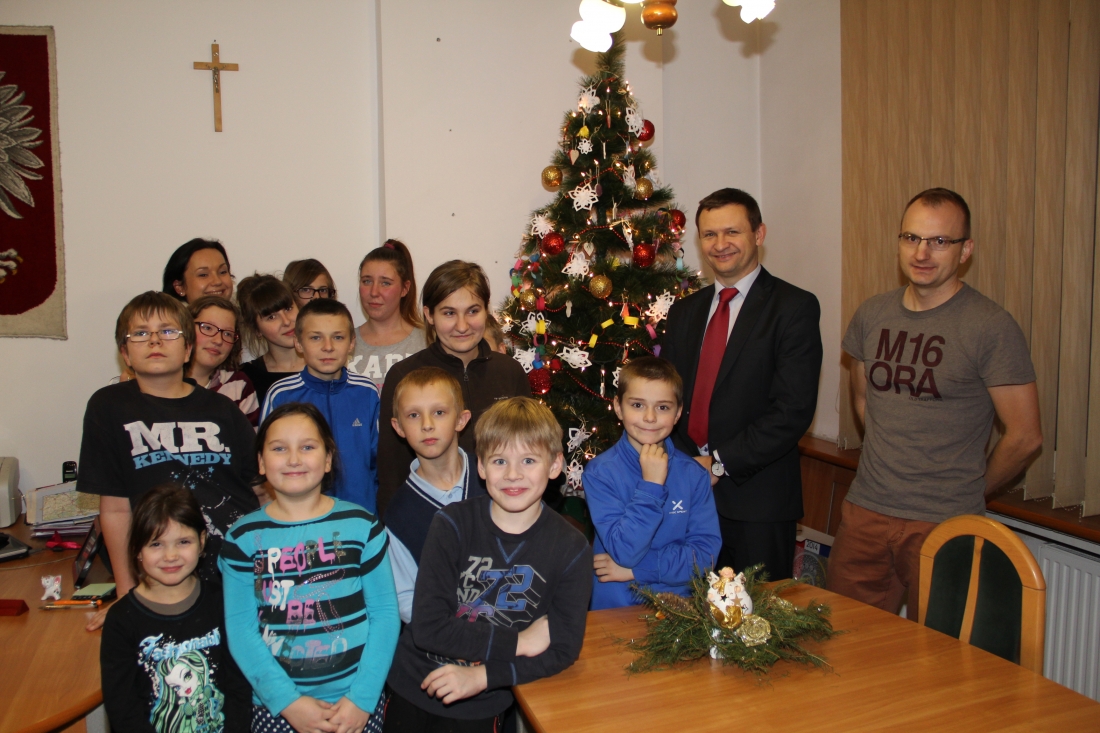 Dzieci ze Świetlicy Środowiskowej swietlik działającej przy MOPS w Brzezinach włąsnoręcznie wykonanymi ozdobami udekorowały choinkę w gabinecie burmistrza Brzezin.