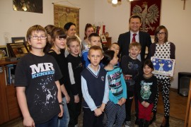 Oprócz życzeń dzieci na ręce burmistrza przekazały upominek - pejzaż sporządzony podczas zajęć warsztatowych.