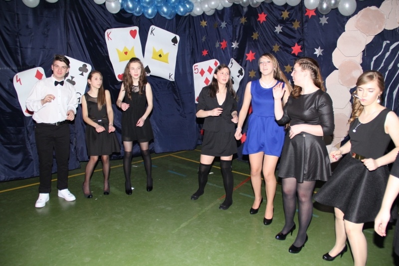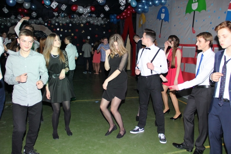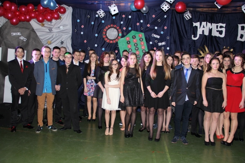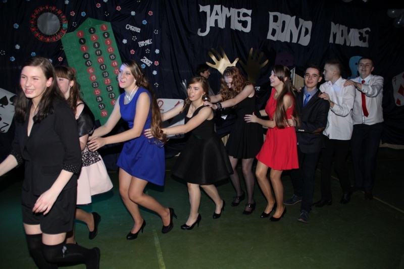 Po oficjalnym otwarciu tegoroczny Gimbal rozpoczął się od wspólnej zabawy. Następnie wykonano pamiątkowe zdjęcia i wreszcie można było rozpocząć uroczystą dyskotekę, która pod opieką rodziców potrwała do godz. 23.30. W przerwach między kolejnymi wizytami na tanecznej sali, do których zapraszała PRODJS GROUP – DJ Black i KarpYou, uczestnicy balu posilali się przy wspólnym stole usytuowanym na szkolnym korytarzu. Warto wspomnieć o wystroju sali, który w tym roku nawiązywał do filmów o agencie 007.