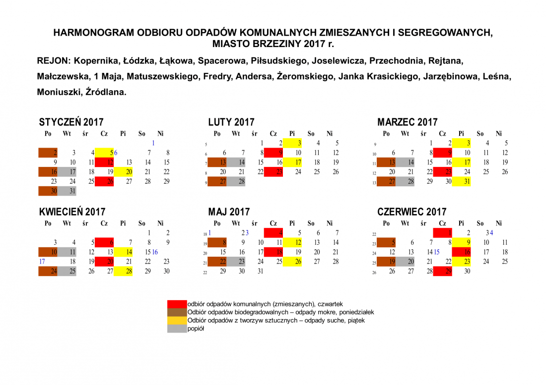 Zapraszamy do zapoznania się z harmonogramem wywozu odpadów komunalnych na pierwszą połowę 2017 roku.