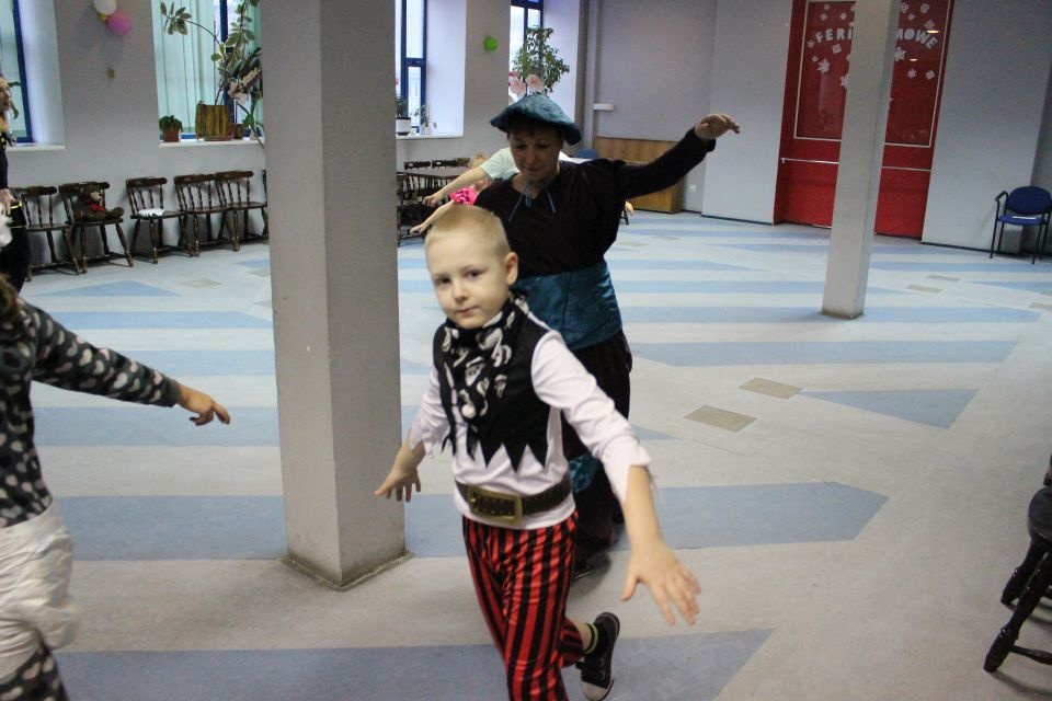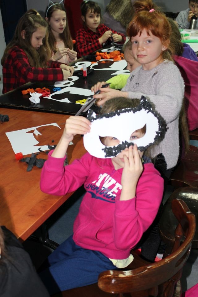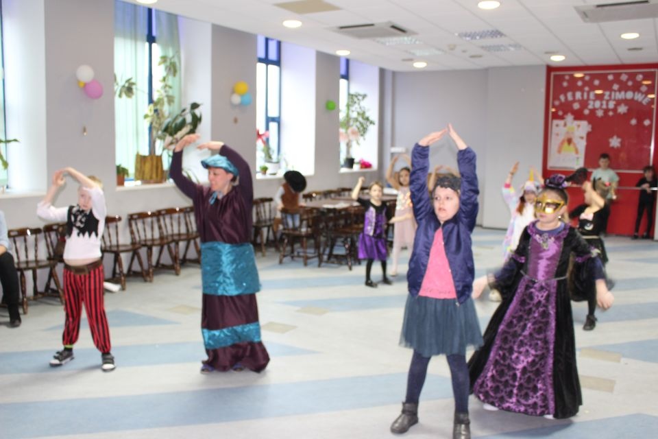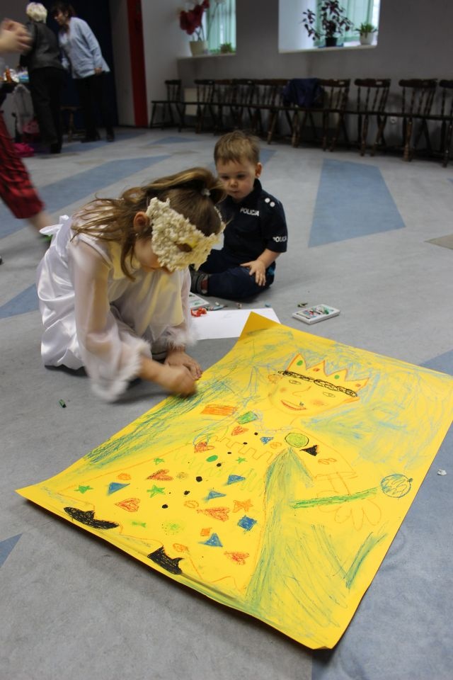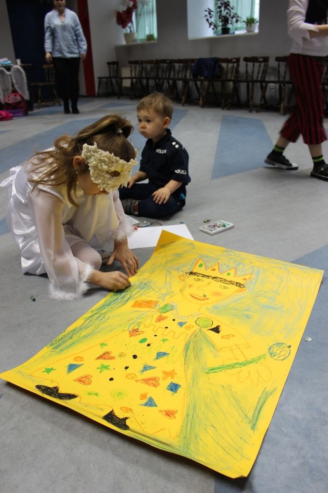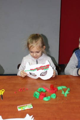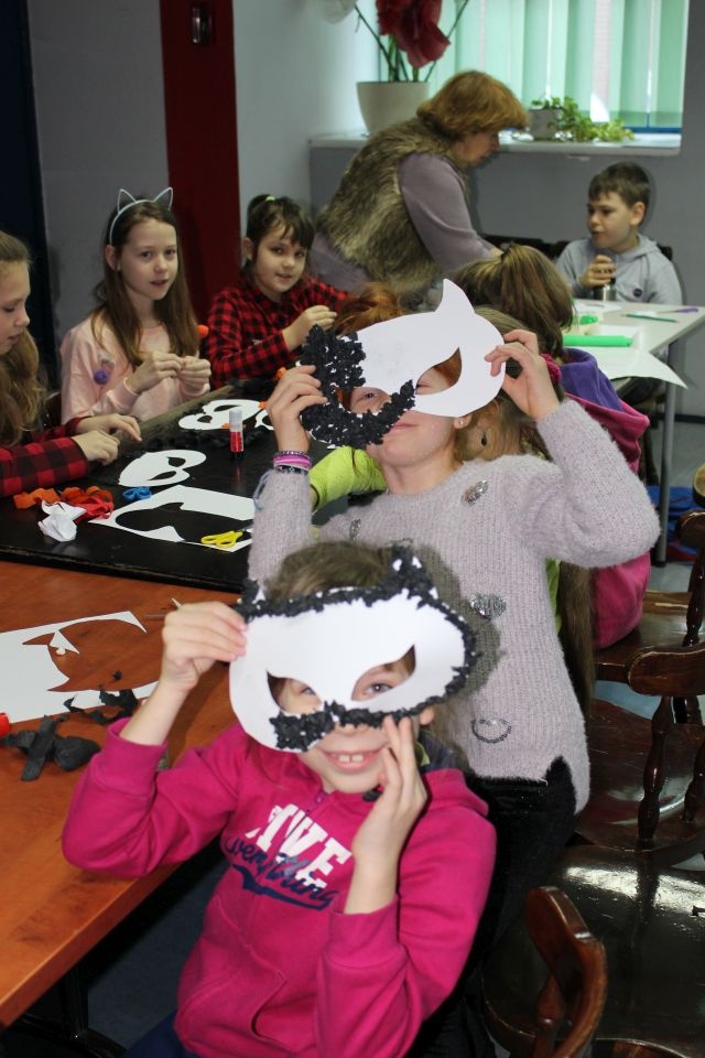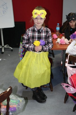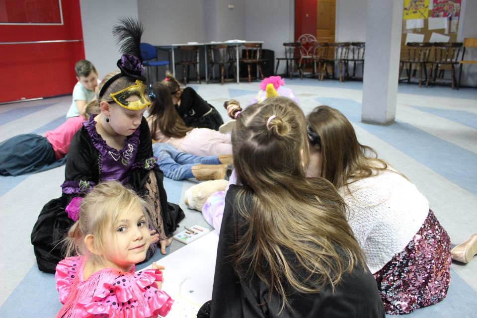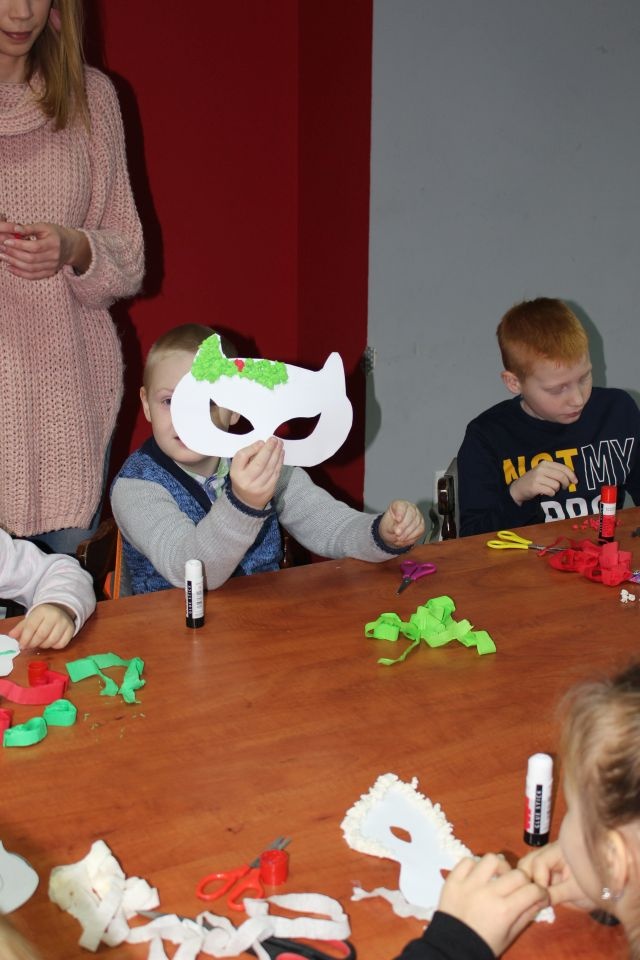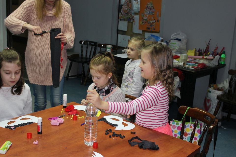 Kolejnego dnia dzieci przygotowywały się do wielkiego finału. Pod okiem Grażyny Bosiackiej wykonywały ozdoby i stroje karnawałowe. Radość z samodzielnej pracy i efekt kreatywnego zastosowania materiałów takich, jak bibuła czy brystol były ogromne. Kolorowe spódnice, maski, kwiaty i peleryny posłużyły podczas zimowego balu karnawałowego.