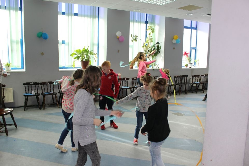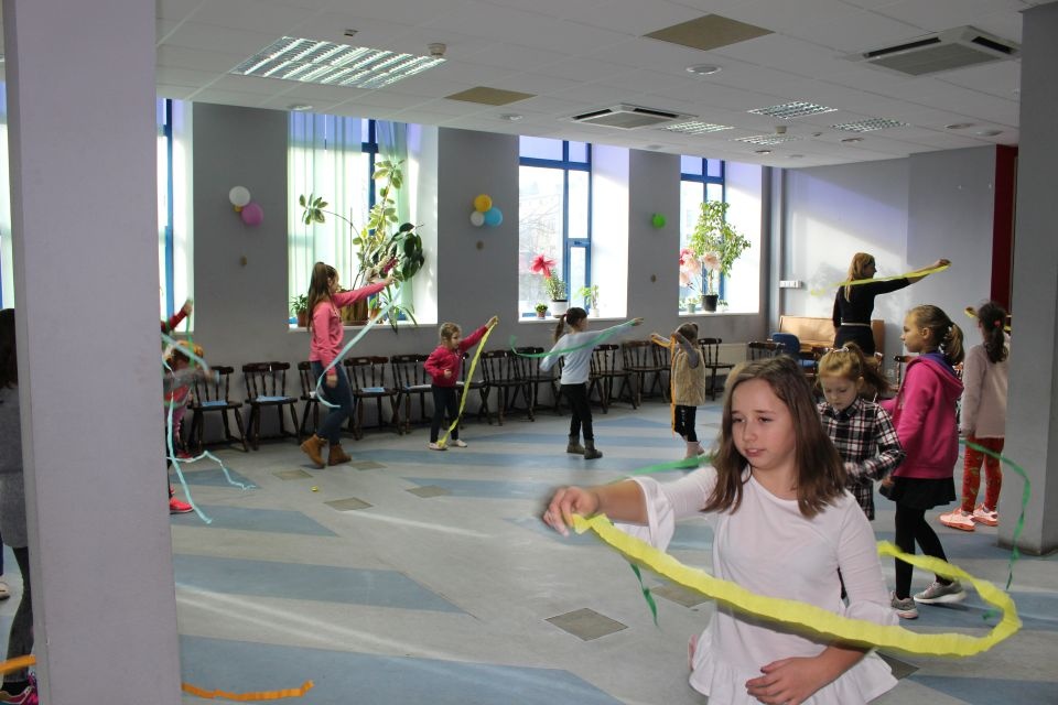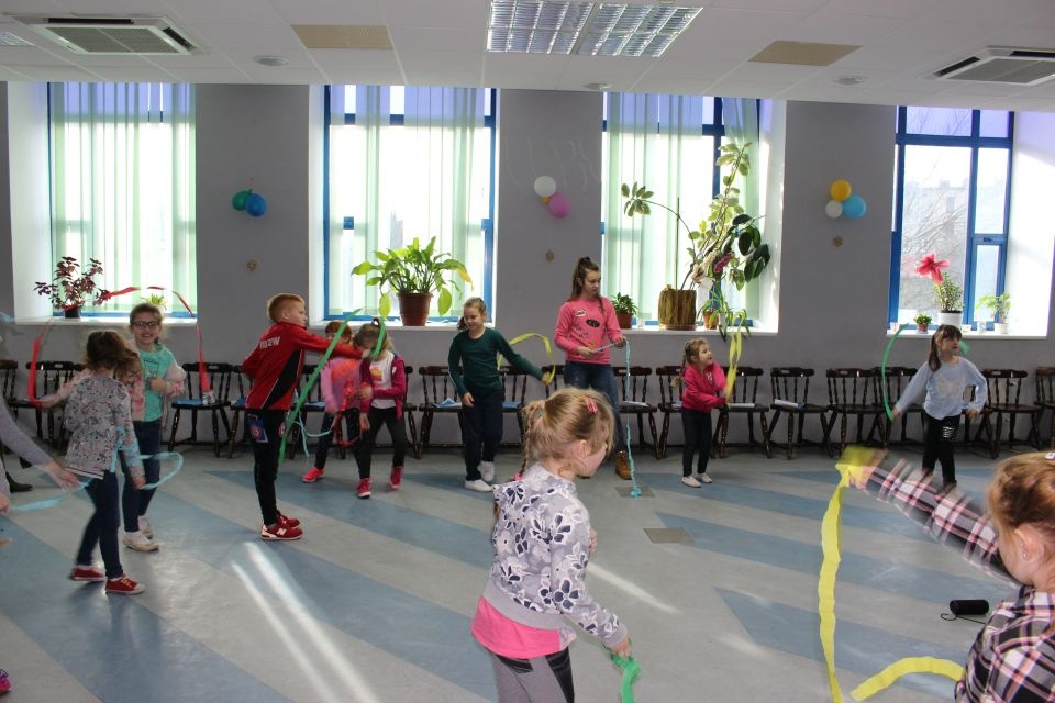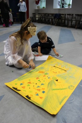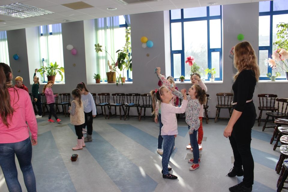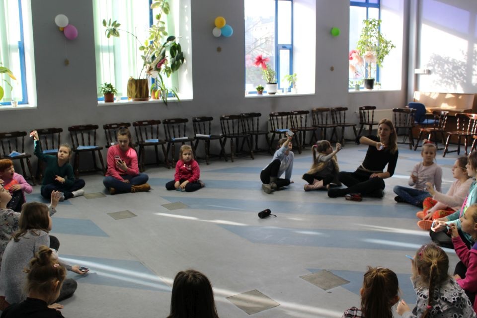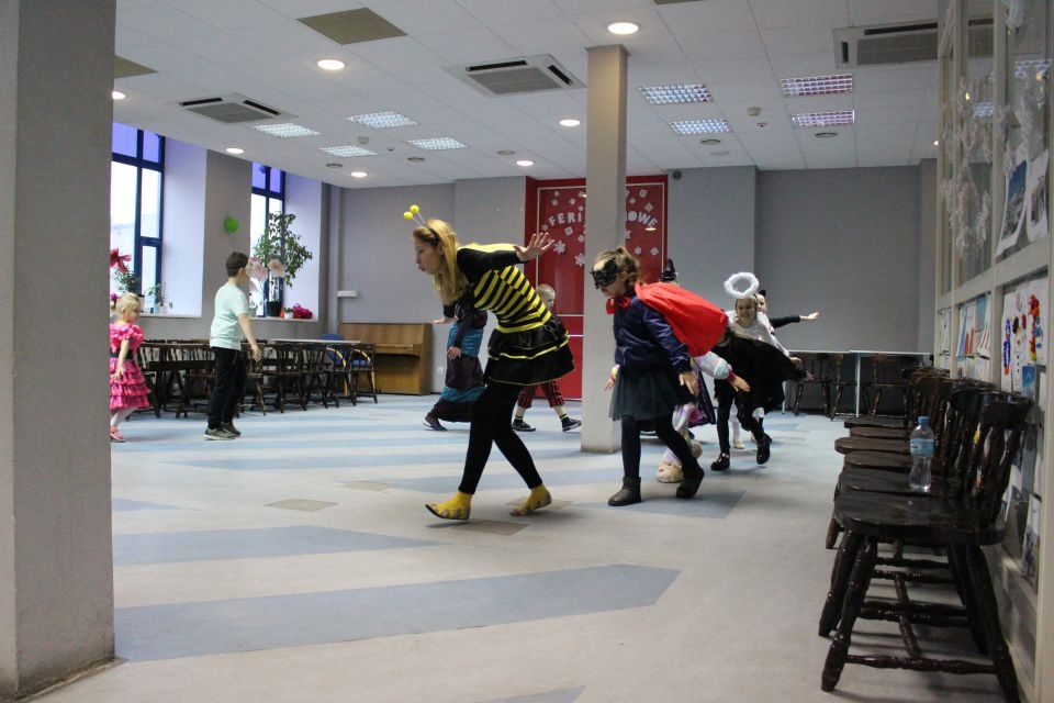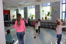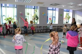 Podczas spotkania z Agatą Ostrowską z Teatru Muzycznego w Łodzi dzieci, w formie zabawy, uczyły się poprawnego wymawiania zgłosek „sz”, „cz” – one zazwyczaj sprawiają najwięcej problemów. Poza tym zajęcia były przepełnione aktywnościami wokalno-ruchowymi.