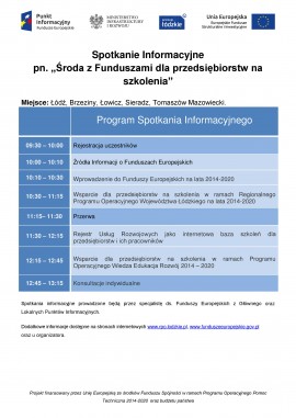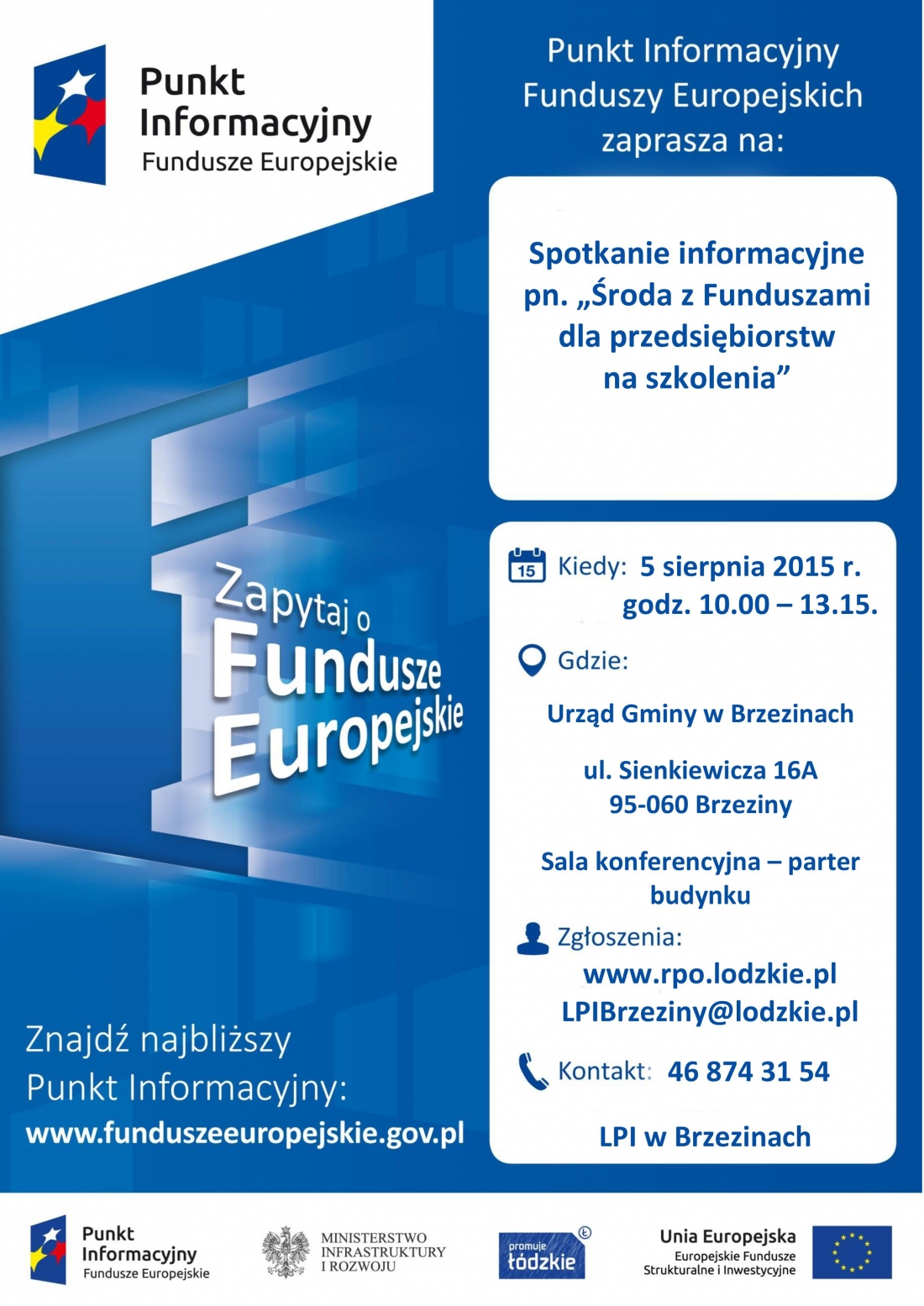 Lokalny Punkt Informacyjny Funduszy Europejskich w Brzezinach w dniu 5 sierpnia 2015r. w Urzędzie Gminy w Brzezinach (ul. Sienkiewicza 16A) organizuje bezpłatne spotkanie informacyjne z cyklu „Środa z Funduszami”.