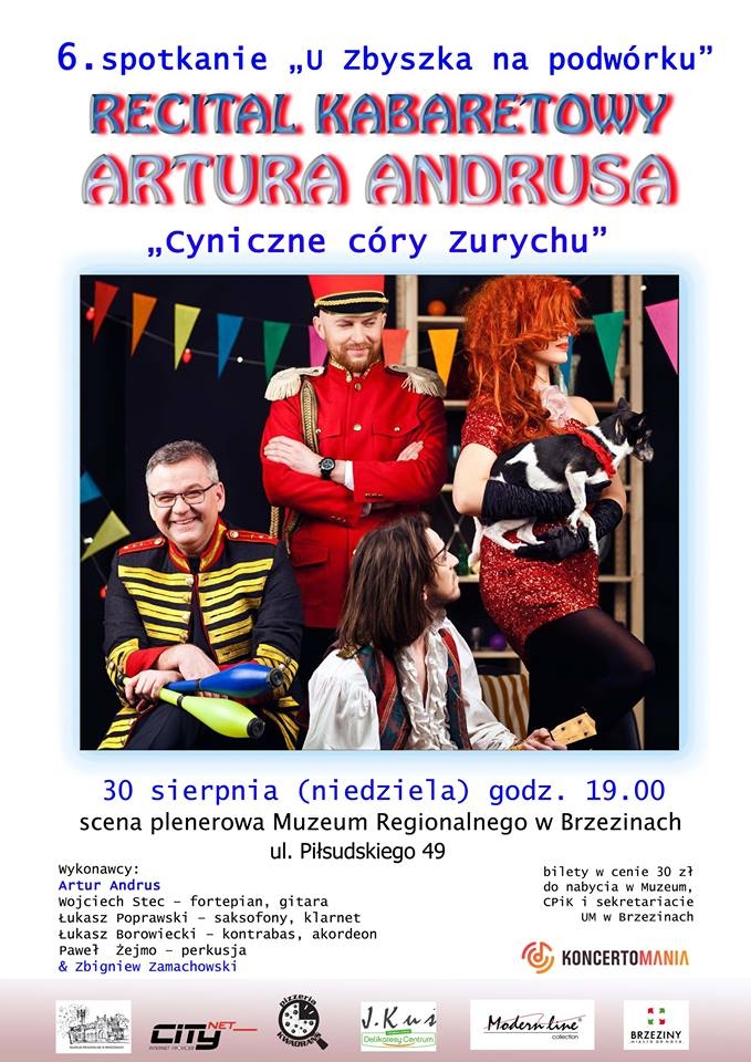 Artur Andrus jest kolejną gwiazdą, która zagości w Brzezinach na zaproszenie Zbigniewa Zamachowskiego w ramach cyklu „U Zbyszka na podwórku”. Bilety w cenie 30 zł. od sierpnia będą dostępne w sprzedaży. Można je nabyć w w sekretariacie Urzędu Miasta Brzeziny, Muzeum Regionalnym oraz w Centrum Promocji i Kultury.