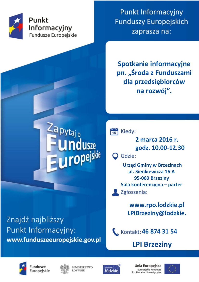 Zapraszamy na spotkanie pn. "Środa z Funduszami dla przedsiębiorców na rozwój", które odbędzie się 2 marca 20016 r. o godzi 10 w sali konferencyjnej Urzędu Gminy w Brzezinach.