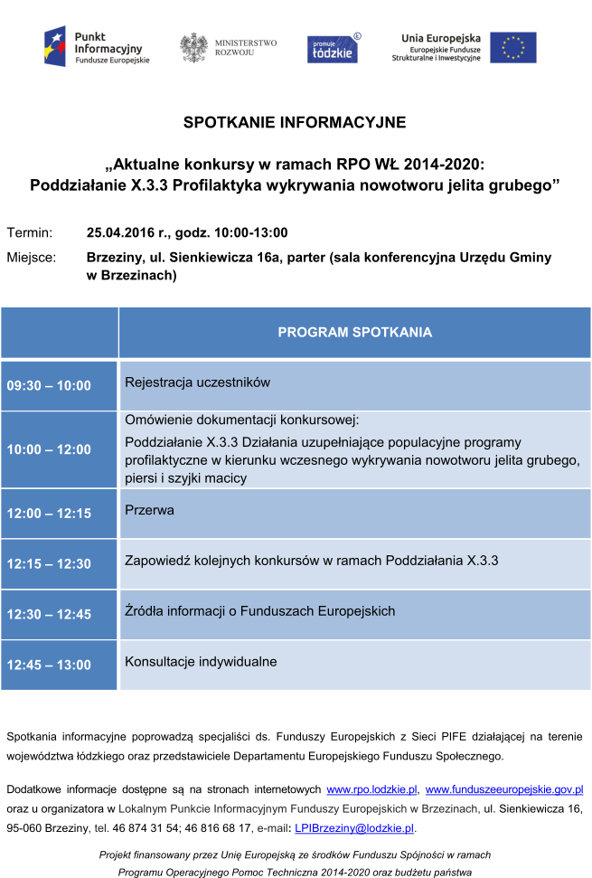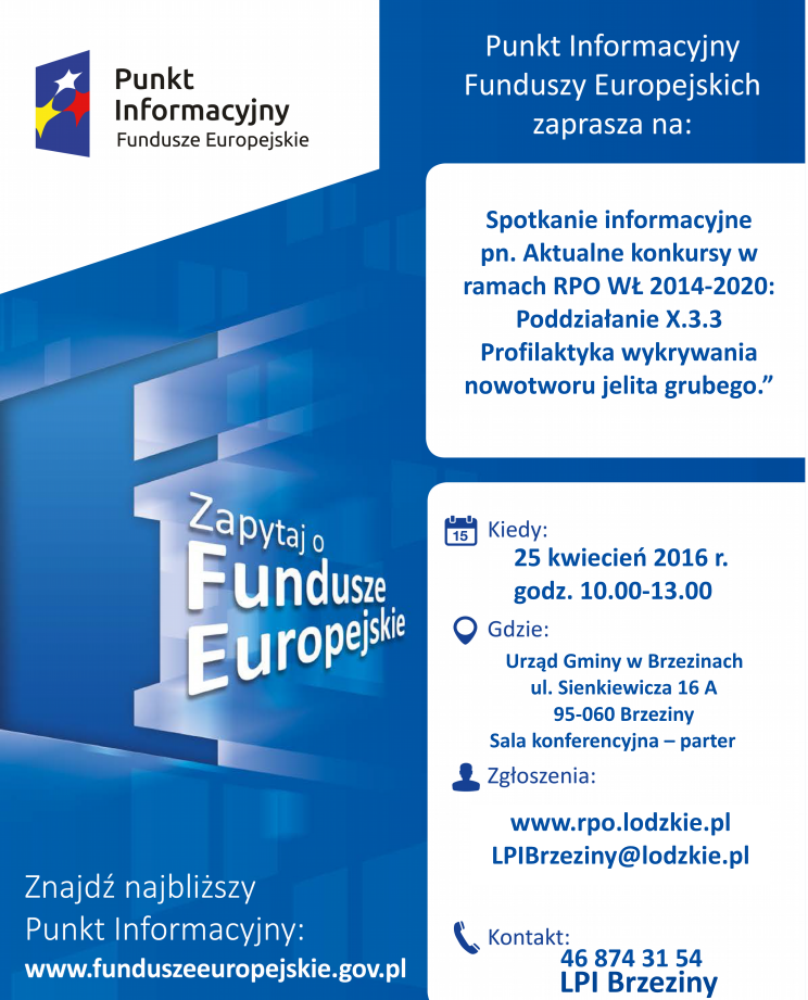Dodatkowe informacje dostępne są na stronach internetowych www.rpo.lodzkie.pl, www.funduszeeuropejskie.gov.pl oraz u organizatora w Lokalnym Punkcie Informacyjnym Funduszy Europejskich w Brzezinach, ul. Sienkiewicza 16, 95-060 Brzeziny, tel. 46 874 31 54; 46 816 68 17, e-mail: LPIBrzeziny@lodzkie.pl.