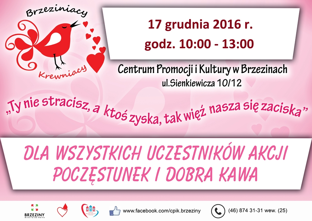 Tym razem spotykamy się 17 grudnia 2016 r. w CPiK w Brzezinach w godzinach 10.00 - 13.00. Być może Twoja krew stanie się bożonarodzeniowym prezentem dla kogoś kto naprawdę jej potrzebuje.