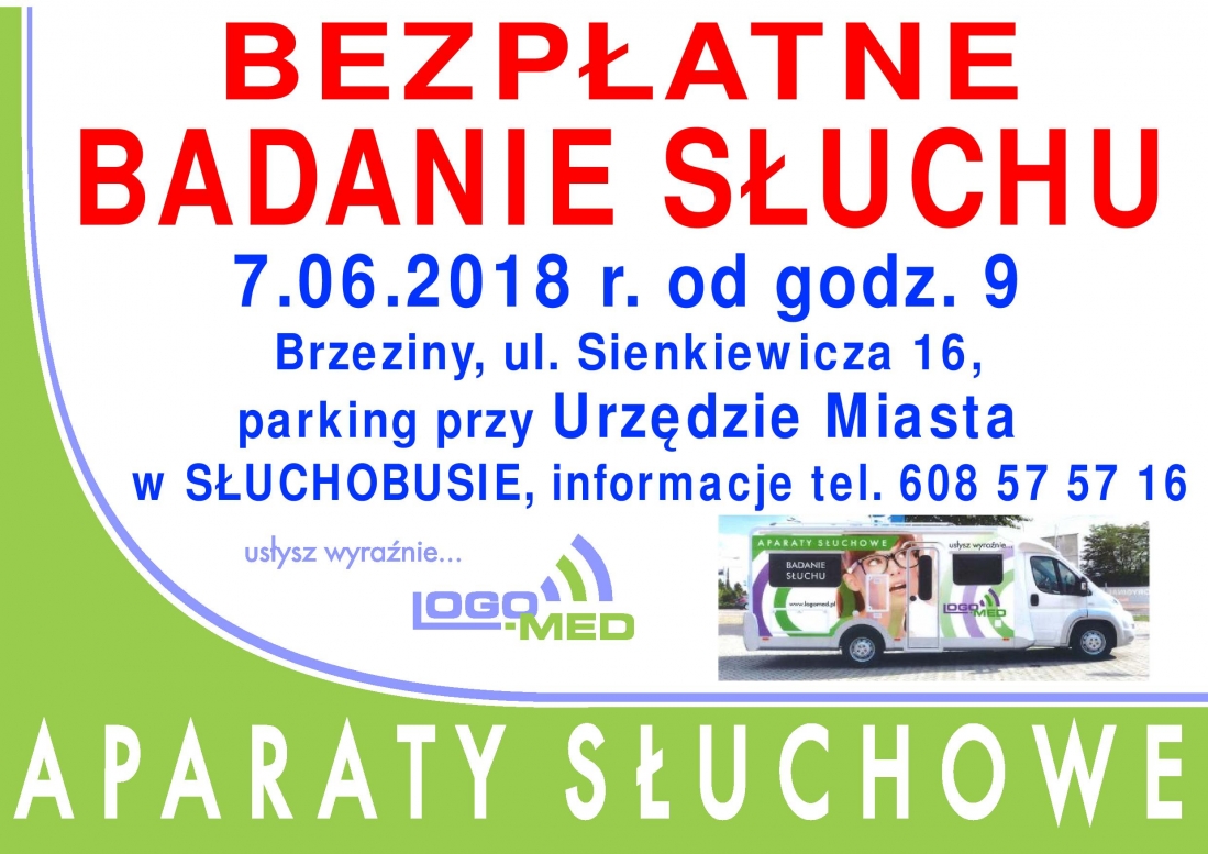 Już 7 czerwca każdy z mieszkańców Brzezin będzie miał okazję bezpłatnie przebadać swój słuch. W specjalnie do tego podstawionym „Słuchobusie”, który stanie obok Urzędu Miasta przy ulicy Sienkiewicza. Badania profilaktyczne słuchu są bardzo ważne dla zdrowia każdego, a wczesne wykrycie wad pozwala szybko i skutecznie je leczyć. W Brzezinach akcja zostanie przeprowadzona przez firmę Logomed, która specjalizuje się w profilaktyce badań i diagnostyki słuchu.