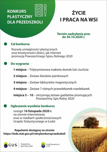 Urząd Statystyczny w Łodzi, odpowiedzialny za realizację Powszechnego Spisu Rolnego 2020 na terenie województwa łódzkiego, serdecznie zaprasza wszystkie placówki wychowania przedszkolnego do wzięcia udziału w konkursie plastycznym pt. „Życie i praca na wsi”. Konkurs ten ma na celu rozwój umiejętności plastycznych i kreatywności dzieci oraz promocję Powszechnego Spisu Rolnego 2020.