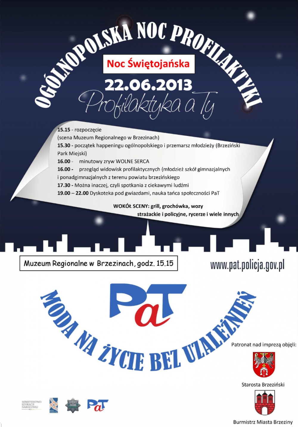 Zapraszamy Państwa do udziału w Ogólnopolskiej Nocy Profilaktyki / Nocy Świętojańskiej. Rozpoczynamy na dziedzińcu Muzeum Regionalnego w Brzezinach.