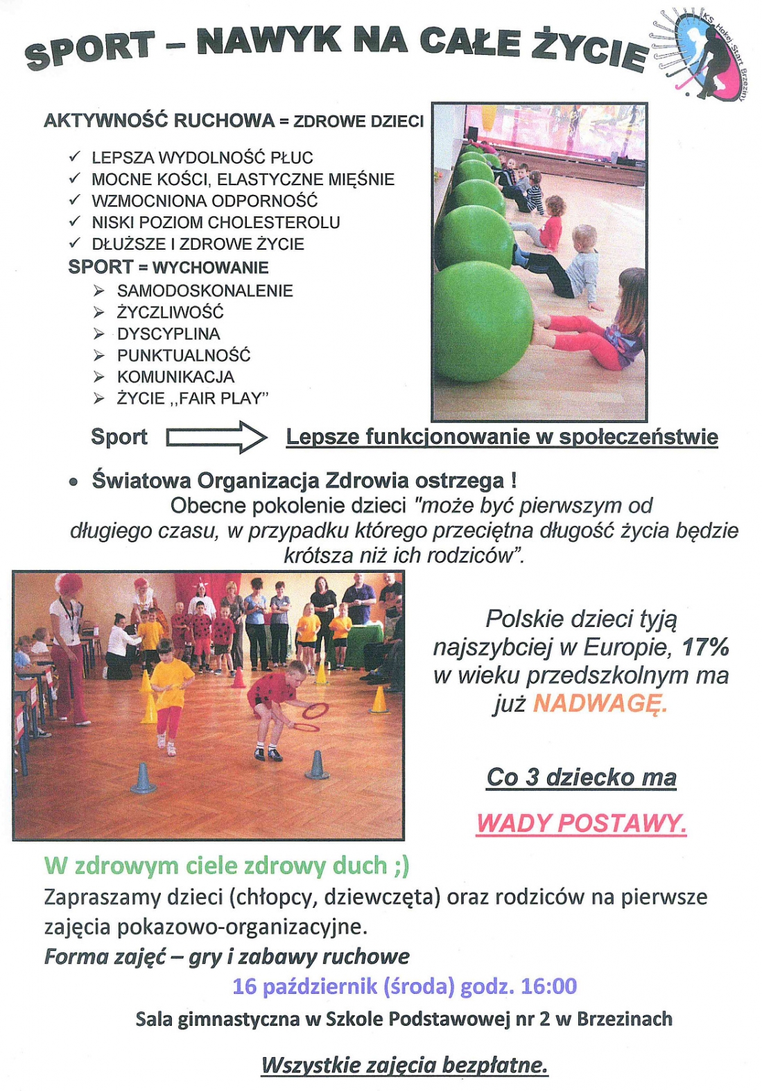 Zapraszamy dzieci (chłopców i dziewczęta) oraz rodziców na pierwsze zajęcia pokazowo-organizacyjne pokazujące jak zdrowy tryb życia i aktywność ruchowa potrafią wpłynąć na zdrowie i lepsze samopoczucie.